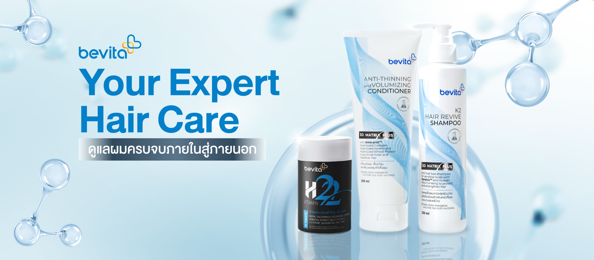 Bevita แชมพูลดผมร่วง สูตรอ่อนโยน เพิ่มความแข็งแรงให้เส้นผม Bevita K2 Hair Revive Shampoo & Bevita ครีมนวดผม ช่วยฟื้นบำรุงและเพิ่มวอลลุ่มให้เส้นผม Bevita Anti-Thinning and Volumizing Conditioner