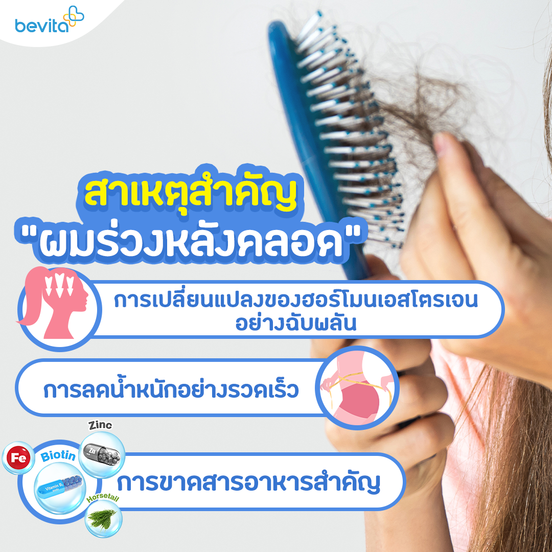 การเปลี่ยนแปลงของฮอร์โมนภายในร่างกายของคุณแม่ เมื่อตั้งครรภ์ร่างกายจะสร้างฮอร์โมนเอสโตรเจนมากขึ้น ทำให้ผมร่วงน้อย แต่หลังจากคลอด ระดับฮอร์โมนเอสโตรเจนก็จะลดลงฉับพลัน ผมที่เคยหยุดร่วงกลับสู่วงจรเดิมอีกครั้ง ผมจึงกลับมาร่วงมากขึ้นนั่นเอง