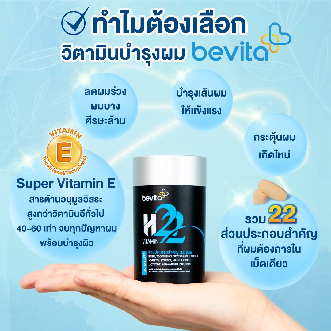 วันนี้! อย่าลืมทานวิตามินบำรุงผม Bevita ตัวช่วยสำคัญในการดูแลผม รวม 22 สารสกัดสำคัญที่ผมต้องการไว้ในสูตรเดียว สะดวกทานง่ายเพียงวันละ 1 เม็ดหลังอาหาร กลับมามั่นใจ จบความกังวลในทุกปัญหาผมร่วง ผมบาง หัวล้าน