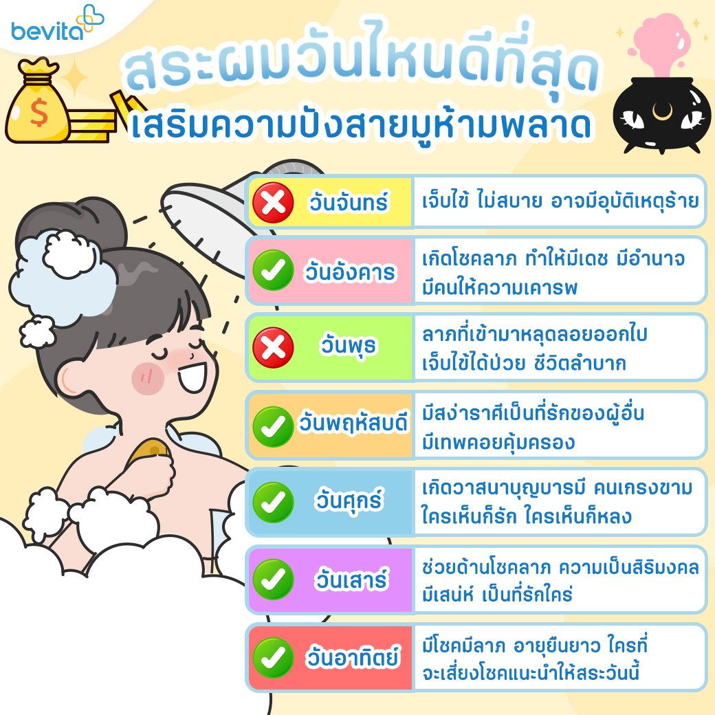 เหล่าสายมูหลังจากได้รู้วันสระผมที่จะเสริมความปังเเละวิธีดูแลเส้นผมให้แก่ตัวเราแล้ว เพียงแค่เปลี่ยนวันสระผมชีวิตก็ปังได้ สระไปก่อนเพื่อความสบายใจ ถ้าสระผมกันเสร็จแล้วก็อย่าลืมใส่ใจ ขั้นตอนการบำรุงผมต่อ แต่บำรุงจากแค่ภายนอกอาจจะยังไม่พอ ลองเปิดใจให้วิตามินบำรุงผม Bevita ที่บำรุงผมจากภายในสู่ภายนอก รับรองไม่มีปัญหาผมร่วง กลับมาผมสวยไม่มีเสียแก้ไขทุกปัญหาผมร่วง ผมบาง แก้ปัญหาที่ต้นตอ เพียงทานแค่วันละ 1 เม็ด หลังมื้ออาหาร รวมสารสกัดสำคัญที่เส้นผมต้องการ สำหรับใครที่สระผมแล้วมีปัญหาผมร่วงเยอะจนผิดปกติอย่าปล่อยไว้รีบดูแลเส้นผมของคุณกันตั้งแต่ตอนนี้ ก่อนที่จะสายเกินไป