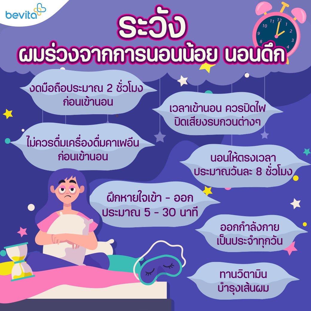 ดังนั้นถ้าหากใครยังไม่อยากผมร่วงจนเสี่ยงไม่มีผมให้หวีในอนาคตควรปรับเปลี่ยนพฤติกรรมการเข้านอนด่วนๆ และควรนอนพักผ่อนให้เพียงพอครบวันละ 8-10 ชั่วโมง เพื่อให้ร่างกายได้รับการพักผ่อนอย่างต็มที่เเละอย่าปล่อยให้การนอนน้อย นอนดึกส่งผลให้เกิดปัญหาผมร่วงตามมาจนหาสายเกินไป รีบหันมาใส่ใจดูแลสุขภาพเส้นผมให้แข็งแรงกันเถอะ พร้อมเสริมวิตามินเเละสารอาหารสำคัญที่เส้นผมต้องการ อย่างวิตามินบำรุงผม Bevita พร้อมช่วยคุณแก้ไขทุกปัญหาเส้นผม ทั้งผมร่วง ผมบาง กระตุ้นเส้นผมให้เกิดใหม่ พร้อมทวงคืนความมั่นใจให้เส้นผมของคุณได้อีกครั้ง กลับมามีผมสวยสุขภาพดี ไม่ต้องกังวลเเละเครืยดเรื่องปัญหาผมอีกต่อไป