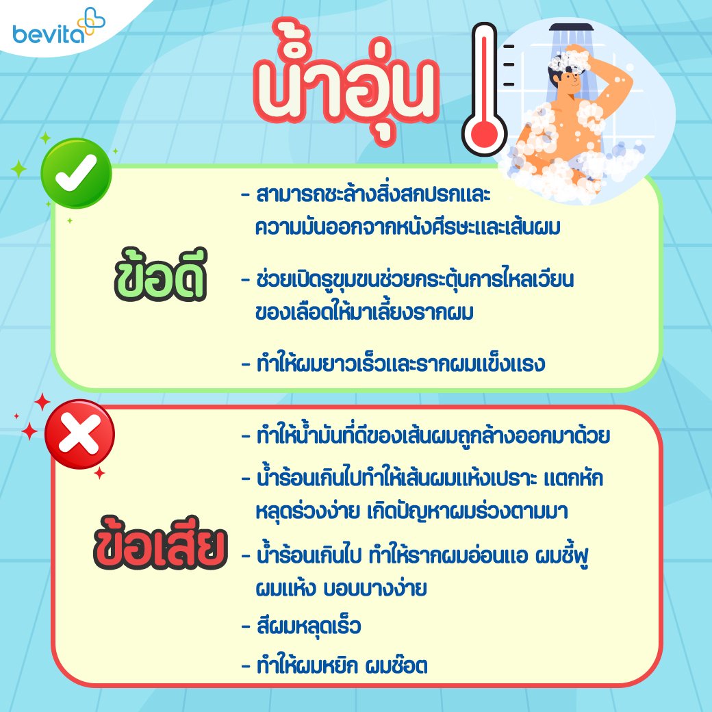 - น้ำร้อนเกินไป ทำให้รากผมอ่อนแอ ผมชี้ฟู ผมแห้ง บอบบางง่าย