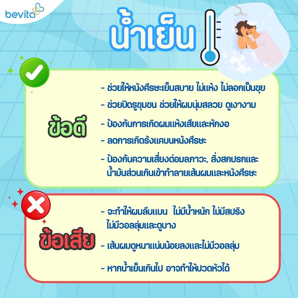 แอดขอเตือนว่าห้ามสระผมด้วยน้ำอุ่นที่อุณหภูมิสูงเเละน้ำร้อนเพราะจะเป็นอันตรายต่อผมมาก แนะนำว่าการสระผมที่ดีต้องสระทั้งน้ำอุ่นและน้ำเย็น ในช่วงแรกสระล้างด้วยน้ำอุ่นก่อนเพื่อเป็นการเปิดเกล็ดผม หลังจากสระและบำรุงเสร็จให้ล้างออกด้วยน้ำเย็นเพื่อปิดเกล็ดผม และเป็นการกักเก็บความชุ่มชื้นที่ได้จากสารบำรุงให้คงอยู่ในเส้นผมด้วย รู้เคล็ดลับการสระผมที่ถูกวิธีแล้ว ใครไม่อยากเจอปัญหาผมร่วง ผมบาง อย่าลืมเติมวิตามินเเละสารอาหารสำคัญที่เส้นผมต้องการอย่างวิตามินบำรุงผม Bevita ตัวช่วยลดปัญหาผมร่วง แก้ปัญหาผมบาง ช่วยกระตุ้นเส้นผมให้เกิดใหม่ พร้อมบำรุงเส้นผมจากภายในสู่ภายนอก เเละกลับมามีผมให้หวีไปด้วยกัน