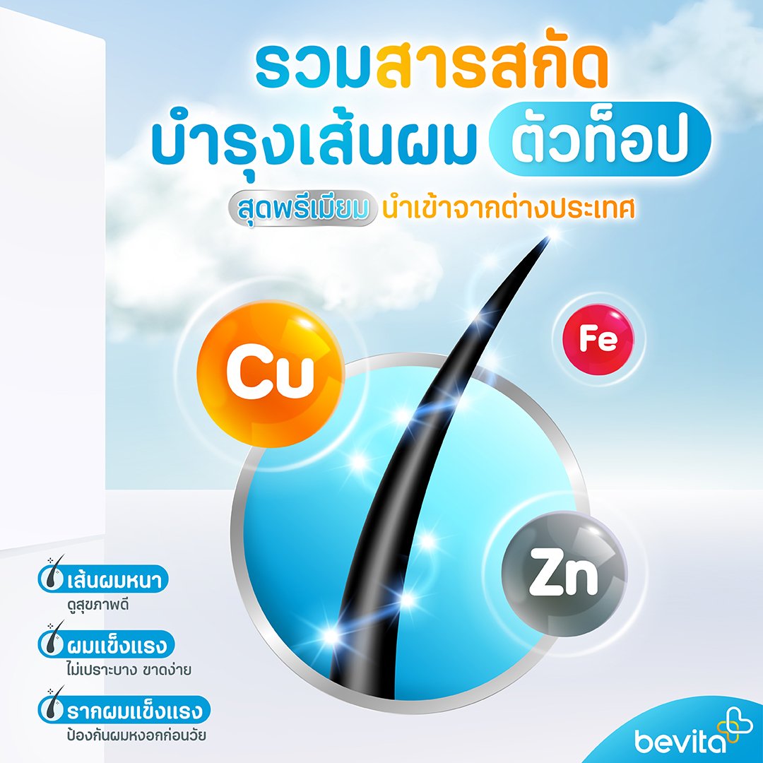 ด้วยวิตามินบำรุงผม Bevita เพียงการกินวิตามินวันละ 1 เม็ด ที่รวบรวมสารอาหารสำคัญสำหรับผม ถึง 22 ชนิด เช่น Biotin ทำให้ผมแข็งแรงลดการหลุดร่วงของเส้นผม Zinc ช่วยในการเจริญเติบโตและแบ่งเซล์รากผม Copper ชะลอการเกิดผมหงอก ช่วยสร้างสารต้านอนุมูลอิสระ เป็นต้นสามารถดูข้อมูลสามารถดูส่วนผสมเพิ่มได้ที่ www.bevita.online