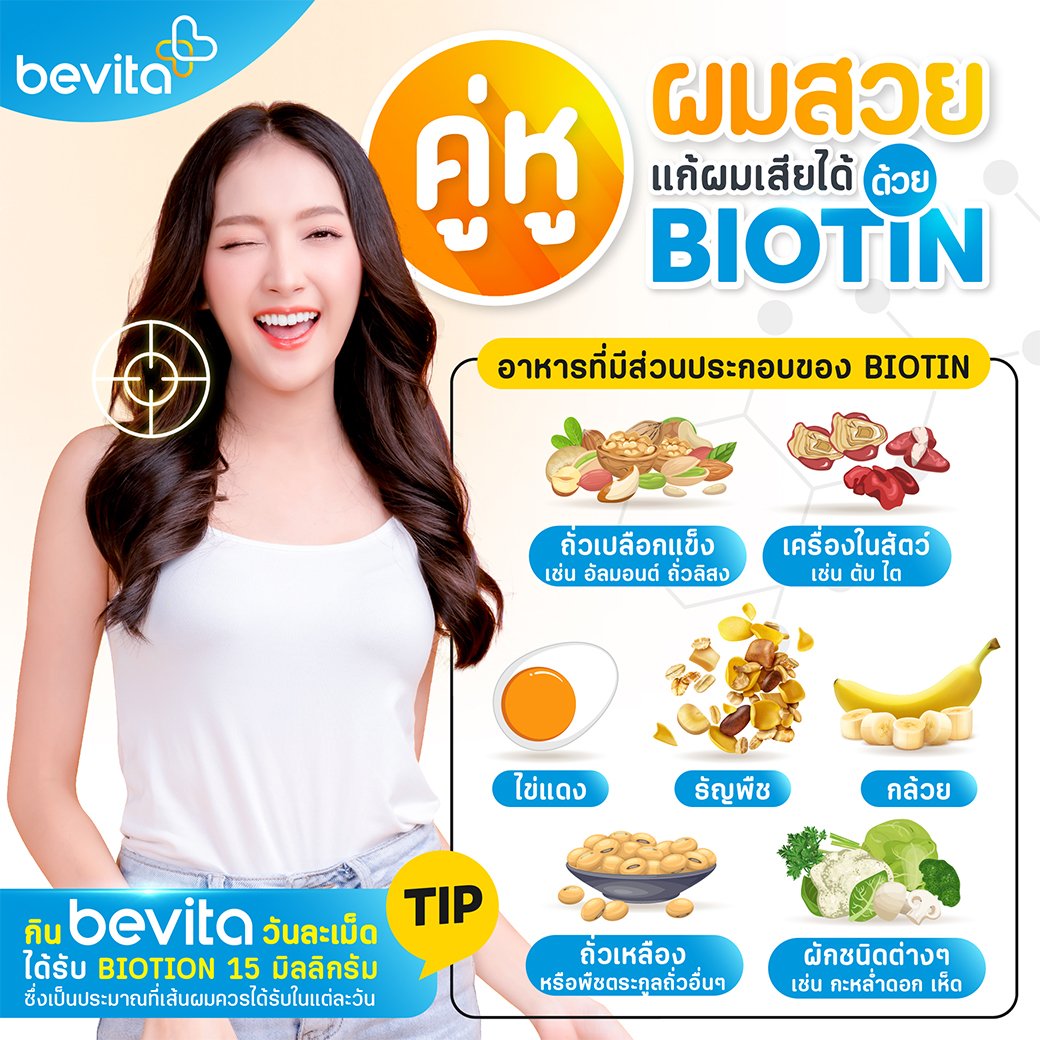ใครที่มีปัญหาผมร่วง ผมบางอยู่ อย่าพึ่งนอยด์ไปอยากแนะนำให้เลือกทานอาหารที่มี Biotin “ไบโอติน” สูงๆ เพื่อเป็นการฟื้นฟูเส้นผมลดปัญหาผมร่วง ผมบาง นอกจากการเลือกรับประทานอาหารที่มีไบโอตินแล้วทางที่ดีในการรักษาอาการผมร่วงผมบางให้ได้ประสิทธิภาพมากที่สุดคือการทานวิตามิน Bevita เพราะได้รวบรวมสารสกัดจากธรรมชาติทั้ง 22 ชนิด ทั้ง Zinc, Biotin, Super Vitamin E, Horsetail และ Millet ที่เป็นสารอาหารสำคัญต่อเส้นผม เพียงทานวันละ 1 เม็ดก็ได้รับสารอาหารและแร่ธาตุเพียงพอต่อปริมาณที่ร่างกายจะได้รับในแต่ละวันเป็นการบำรุงเส้นผมแบบมีประสิทธิภาพเพิ่มมากขึ้น