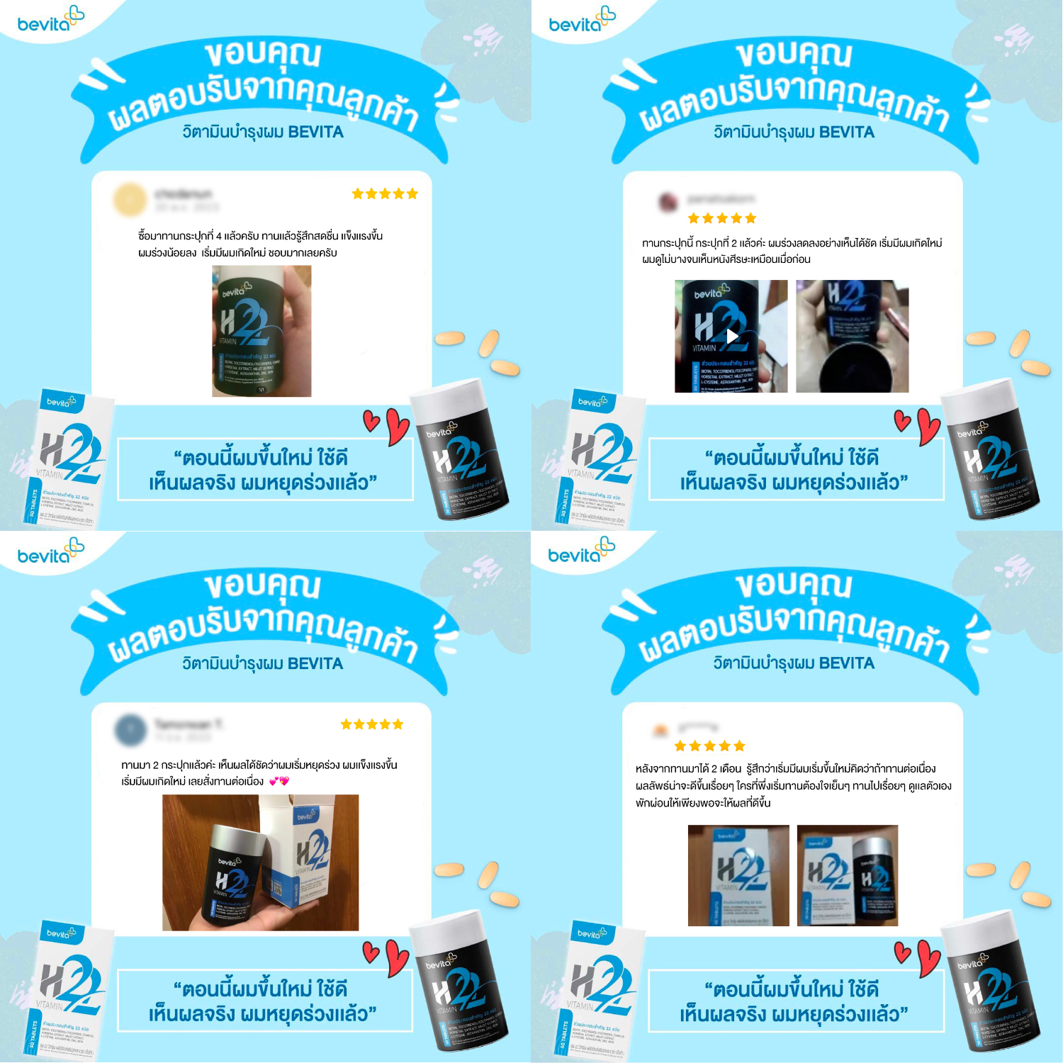 จากความตั้งใจของวิตามินผม Bevita ที่อยากให้ทุกคนหมดปัญหาผมร่วง ผมบาง ได้มีสุขภาพผมที่ดีขึ้น หมดปัญหาผมร่วง ผมบาง อย่างยั่งยืน กลับมามั่นใจได้อีกครั้ง เพราะสิ่งสำคัญที่เป็นเครื่องการันตีความสำเร็จคือคำรีวิวคำบอกเล่าจากผู้ใช้จริงกว่าหลายหมื่นคน ที่ได้มาแชร์เรื่องราวผลลัพธ์ดี ๆ อาทิ “ทานไปประมาณ 3 วีค ตอนสระผม ผมหลุดติดมือออกมาน้อยลงมากค่ะ” หรือ “ผมหนาขึ้นมากครับกล้าที่จะเข้าร้านตัดผมแล้วครับ”