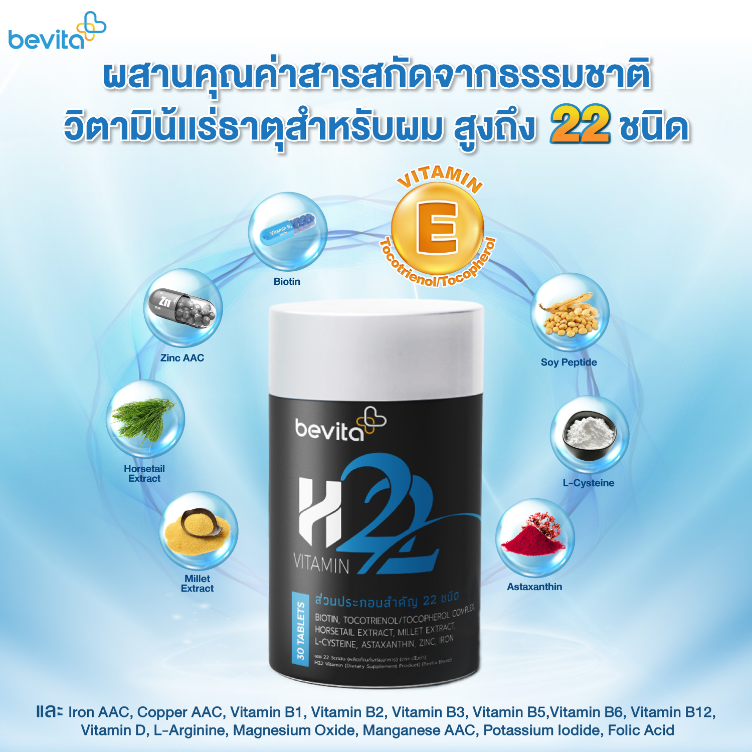 อีกหนึ่งเหตุผลที่ผู้ประสบปัญหาผมร่วง ผมบาง เลือกวิตามินผม Bevita ไม่ใช่แค่ความเชื่อใจในแบรนด์ Bevita แต่เป็นคุณภาพของวิตามินที่เราเข้าใจคนที่เจอกับทุกปัญหาผมร่วง ผมบางเป็นอย่างดี จึงได้คัดเลือกสิ่งที่ดีที่สุด และรวบรวมสารสกัดจากธรรมชาตินำเข้าเกรดพรีเมี่ยมระดับโลกที่เส้นผมต้องการกว่า 22 ชนิด ไม่ว่าจะเป็น Tocotrienol / Tocopherol Complex ที่มีสารต้านอนุมูลอิสระสูงกว่าวิตามินอีทั่วไป 60 เท่า, Horsetail ช่วยกระตุ้นให้เส้นผมเจริญเติบโต, Millet กระตุ้นเซลล์รากผมในการสร้างเคราตินล, Biotin ช่วยให้สภาพหนังศีรษะเหมาะกับการเกิดใหม่ของเส้นผม, Zinc ยับยั้งการเปลี่ยนฮอร์โมนเป็น DHT, L-cysteine ส่งผลต่อการงอกใหม่ของเส้นผม, Soy peptide กระตุ้นเซลล์รากผมให้งอกใหม่, Astaxanthin แก้ผมร่วง ปกป้องเส้นผม ลดการอักเสบของหนังศีรษะ เเละยังเสริมด้วย Iron AAC, Coopper AAC, Vitamin B1, Vitamin B2, Vitamin B3, Vitamin B5, Vitamin B6, Vitamin B12, Vitamin D, L-arginine, Magnesium Oxide, Manganese AAC, Potassium Iodide, Folic Acid