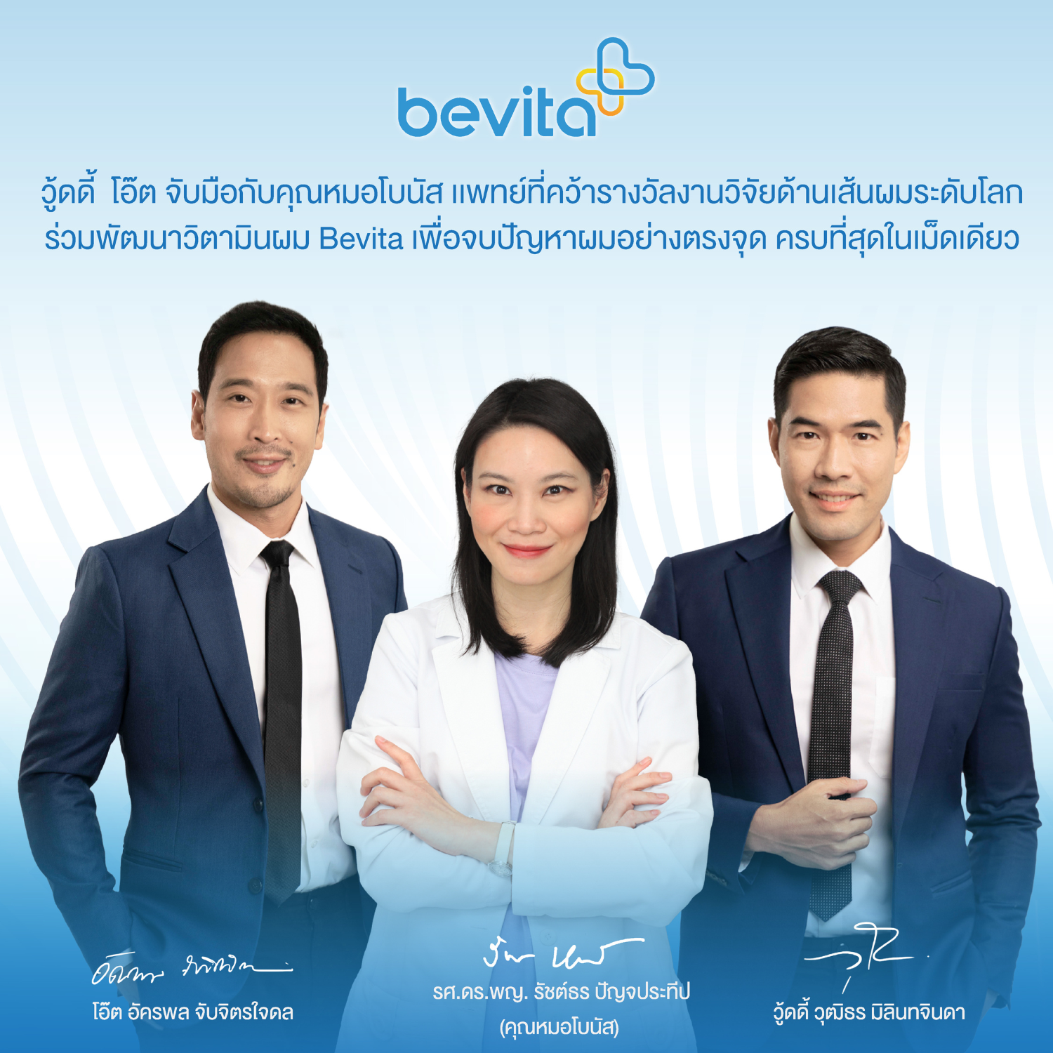 คุณวู้ดดี้ (วุฒิธร มิลินทจินดา) และ คุณโอ๊ต (อัครพล จับจิตใจดล) เป็นหนึ่งในผู้ประสบปัญหาผมร่วง ผมบางอย่างหนัก โดยทั้งคู่เผยว่า เคยละเลยกับปัญหาผมจนเป็นเหตุให้ชีวิตเกือบพัง หมดความมั่นใจถึงขั้นไม่กล้ารับงาน ไม่กล้าเจอใคร ลองแก้ปัญหามาหลายวิธีแต่ก็ยังไม่ได้ผลที่ยั่งยืน จนได้มาพบกับ คุณหมอโบนัส (รศ.ดร.พญ.รัชต์ธร ปัญจประทีป) แพทย์ผู้เชี่ยวชาญด้านเส้นผมโดยตรง เพื่อปรึกษาถึงปัญหาการเกิดผมร่วง ผมบางและการแก้ปัญหาอย่างถูกวิธี และได้ร่วมมือก่อตั้งแบรนด์ Bevita วิตามินสำหรับบำรุงผม เพื่ออยากให้คนที่เจอปัญหาเดียวกัน หมดปัญหาผมร่วง ผมบาง เกิดการเปลี่ยนแปลงอย่างยั่งยืน โดยวิตามินเป็นส่วนประกอบพื้นฐานของเซลล์สร้างรากผม หรือเซลล์ต่างๆ ที่เกี่ยวข้องกับเส้นผม และยังเสริมให้เซลล์ทำงานได้ดีมากยิ่งขึ้น ซึ่งกระบวนการทำงานในเดือนแรกสารอาหารต่างๆ จากวิตามินผม จะไปช่วยบำรุงซ่อมแซม ลดการเสื่อมของเซลล์รากผม จนสังเกตุได้ว่าผมร่วงน้อยลง เมื่อทานต่อเนื่องในเดือนที่สอง วิตามินจะไปเร่งการทำงานของเอนไซม์ ที่ทำหน้าที่ควบคุมการแบ่งตัวของเซลล์รากผม ทำให้เส้นผมเจริญเติบโตต่อเนื่องและงอกใหม่มากขึ้น เมื่อเข้าเดือนที่สาม เส้นผมได้รับการบำรุง ไม่เปราะขาดง่าย เริ่มหนาแข็งเเรงอย่างเห็นได้ชัด โดยการรักษาปัญหาผมด้วยการรับประทานวิตามินเป็นเพียงการดูแลรักษาปัญหาผมเบื้องต้น ซึ่งผลลัพธ์ที่ชัดเจนขึ้นอยู่กับร่างกายของแต่ละบุคคล ในทางที่ดีควรดูแลสุขภาพร่างกายเพิ่มเติม พักผ่อนให้เพียงพอ เพื่อประสิทธิภาพของวิตามินที่ดีมากยิ่งขึ้น
