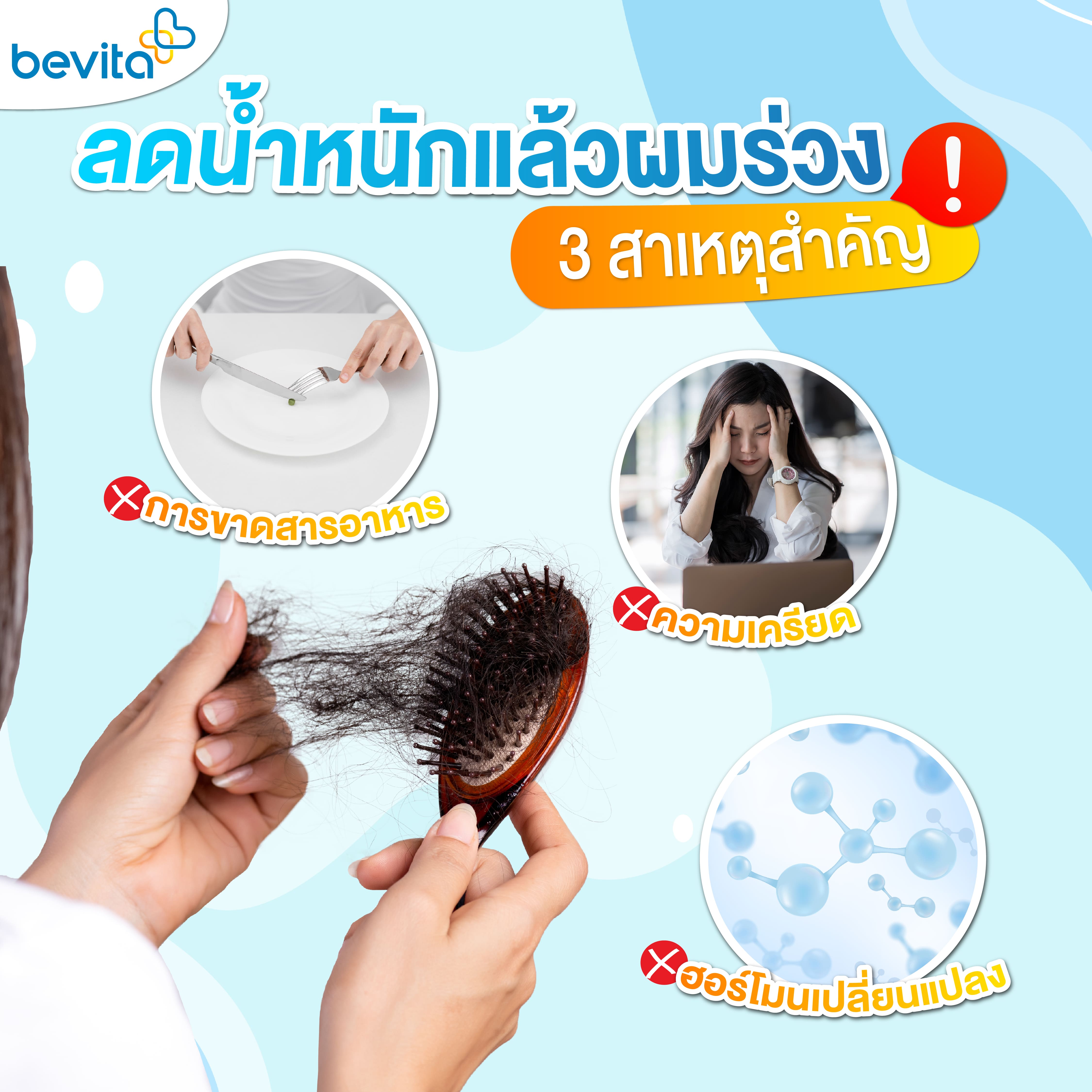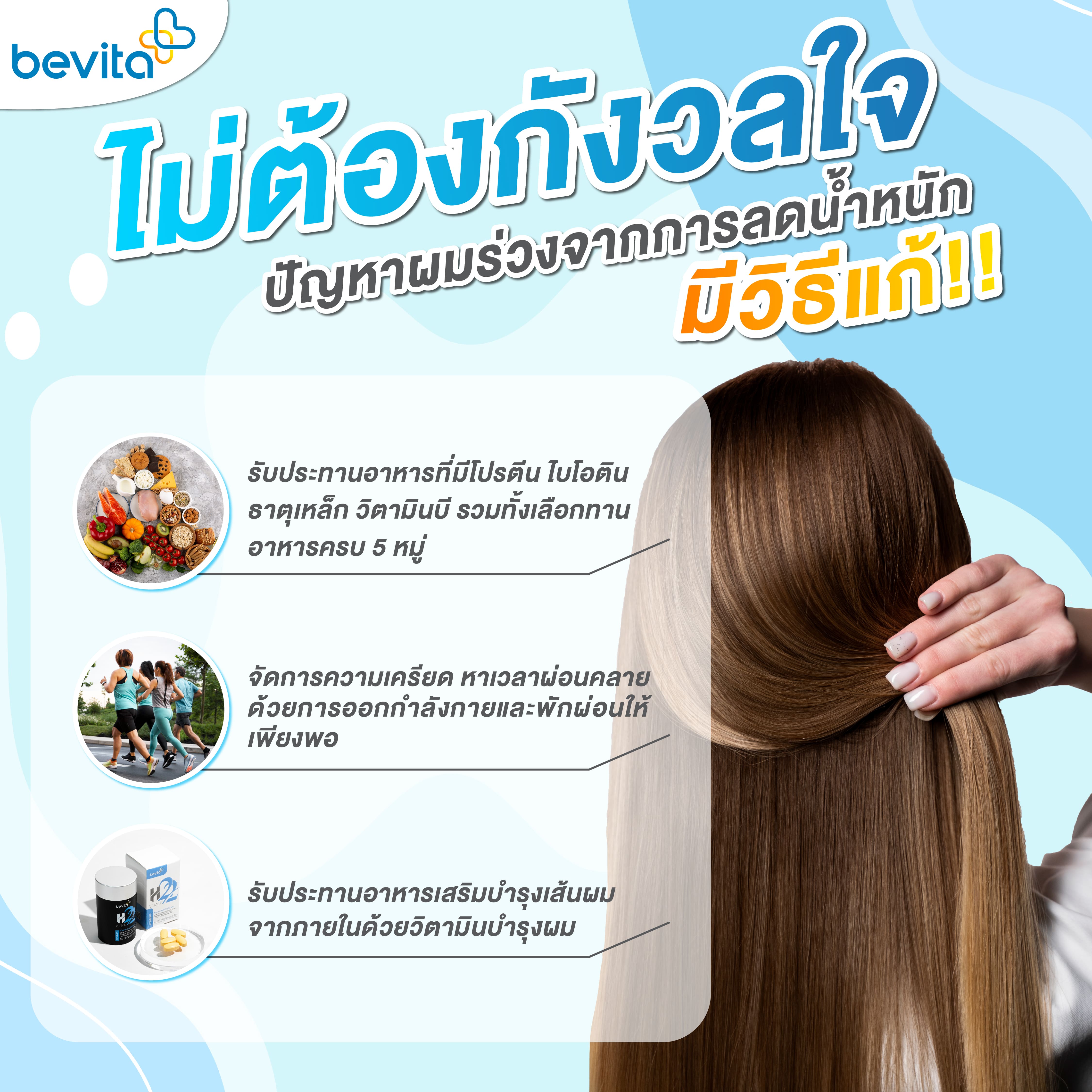 ดังนั้นใครที่กำลังประสบปัญหาลดน้ำหนักแล้วผมร่วงอยู่แนะนำให้เลือกทานอาหารที่มี Biotin “ไบโอติน”สูงเพื่อฟื้นฟูเส้นผม ลดปัญหาผมร่วงและการจัดการความเครียดที่เป็นอีกหนึ่งสาเหตุ หลักทำให้ลดน้ำหนักแล้วผมร่วง ด้วยวิธีต่างๆ เช่น พักผ่อนให้เพียงพอและรับประทานอาหารที่มีประโยชน์นอกจากการเลือกรับประทานอาหารที่มี ไบโอตินและจัดการความเครียดแล้ววิธีแก้ผมร่วงให้ได้ประสิทธิภาพมากที่สุดคือการทานวิตามินบำรุงผม Bevita เพราะได้รวบรวมสารสกัดจากธรรมชาติทั้ง 22 ชนิด ทั้ง Zinc, Biotin, Super Vitamin E, Horsetail และ Iron ที่เป็นสารอาหารสำคัญต่อเส้นผม มีส่วนช่วยลดผมร่วง ทำให้เส้นผมกลับมาแข็งแรงมีสุขภาพที่ดีขึ้นพร้อมทวงคืนความมั่นใจกลับมาได้อย่างแน่นอนสุขภาพผมดีด้วย Bevita