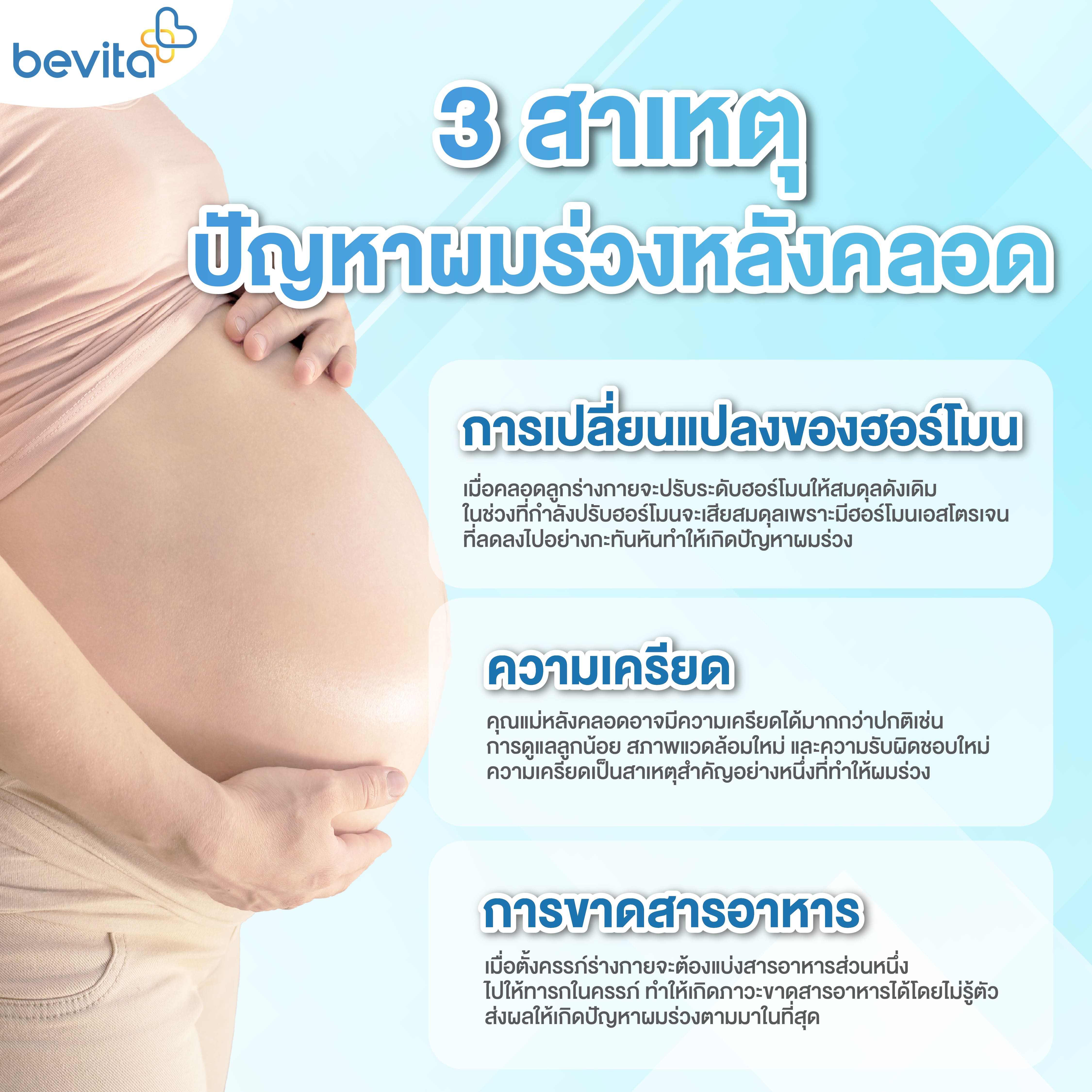 วิตามินผม Bevita พร้อมจบทุกปัญหาผมร่วง ผมบางพร้อมสร้างผมเกิดใหม่ทำให้เส้นผมแข็งแรงสุขภาพดีขึ้นทำให้คุณแม่กลับมามั่นใจได้อีกครั้ง หมดกังวลปัญหาผมร่วง วิตามินผมที่รวบรวมสารสกัดจากธรรมชาติทั้ง 22 ชนิด ที่ผมต้องการในสูตรเดียวทั้ง Zinc, Biotin, SuperVitaminE, Horsetail และ Iron เป็นต้น และช่วยเติมสารอาหารที่เส้นผมต้องการเป็นพิเศษให้ผมที่หลุดร่วงกลับมาเกิดใหม่อีกครั้ง เหมาะกับคุณแม่ที่มีปัญหาผมร่วงหลังคลอด สามารถทานวิตามินบำรุงผมให้แข็งแรงจากภายในเพื่อ ผมเงางาม สุขภาพดีสามารถทานได้อย่างต่อเนื่องปลอดภัยและไม่มีผลข้างเคียงในการให้นมลูกน้อย Bevita แบรนด์ที่เข้าใจคนมีปัญหาผมดูแลผม แบบครบสูตร